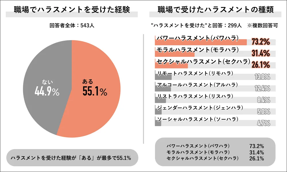 Job総研が実施した「2025年 ハラスメント実態調査 〜被害・職場対策編〜」によると、「職場でハラスメントを受けた経験がある」と回答した人は55.1%にのぼりました。さらに、そのうちの31.4%がモラハラを受けたと回答。モラハラはパワハラに次いで多いハラスメント被害となっています。