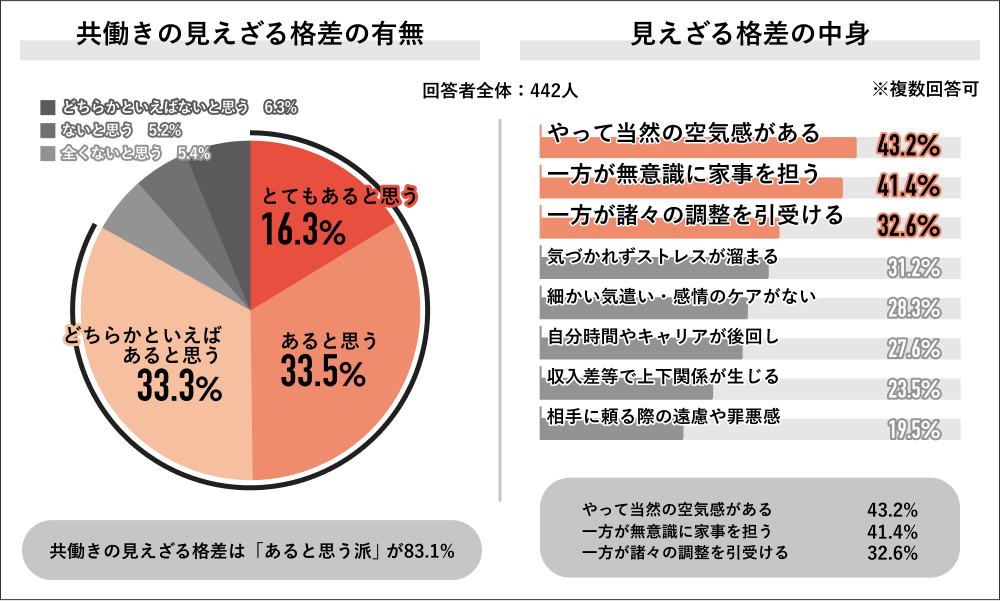 回答者全体の442人に共働きにおける見えざる格差の有無を聞くと、「あると思う派」が83.1%で大多数を占め、内訳は「とてもあると思う」が16.3%、「あると思う」が33.5%、「どちらかといえばあると思う」が33.3%となりました。また、見えざる格差の中身を聞くと、「やって当然の空気感がある」が43.2%で最多となり、次いで「一方が無意識に家事を担う」が41.4%、「一方が諸々の調整を引受ける」が32.6%となりました。