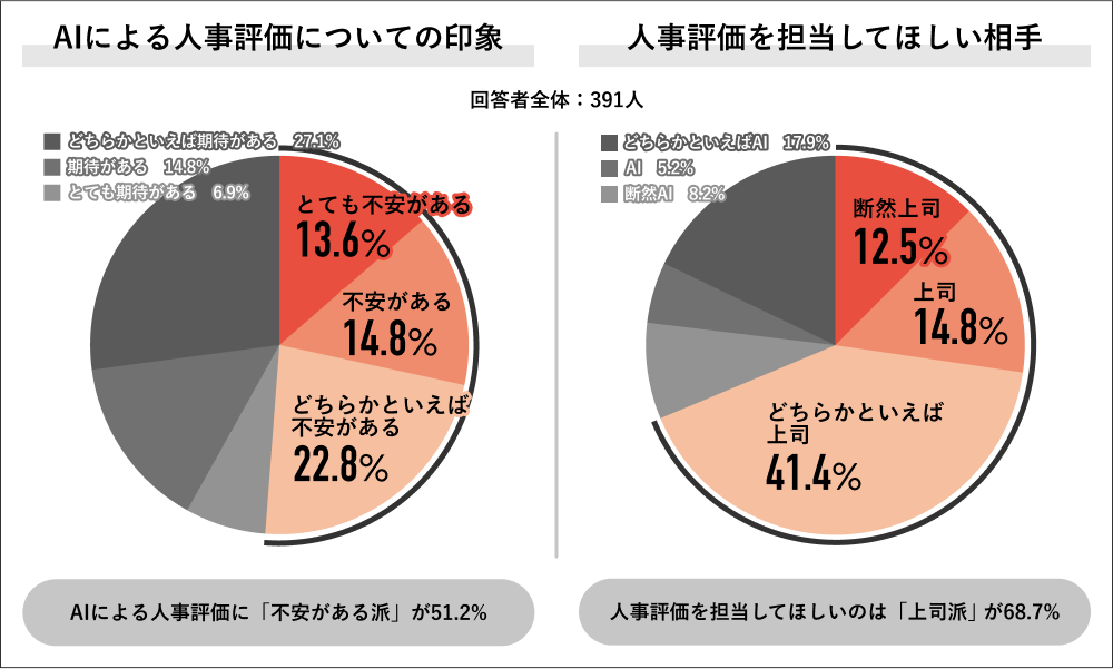 回答者全体の391人に、AIによる人事評価についての印象を聞くと、「不安がある派」が51.2%と過半数を占め、内訳は「とても不安がある」が13.6%、「不安がある」が14.8%、「どちらかといえば不安がある」が22.8%となりました。また、上司とAIのどちらに人事評価をしてもらいたいかを聞くと、「上司派」が68.7%と過半数を占め、内訳は「断然上司」が12.5%、「上司」が14.8%、「どちらかといえば上司」が41.4%となりました。