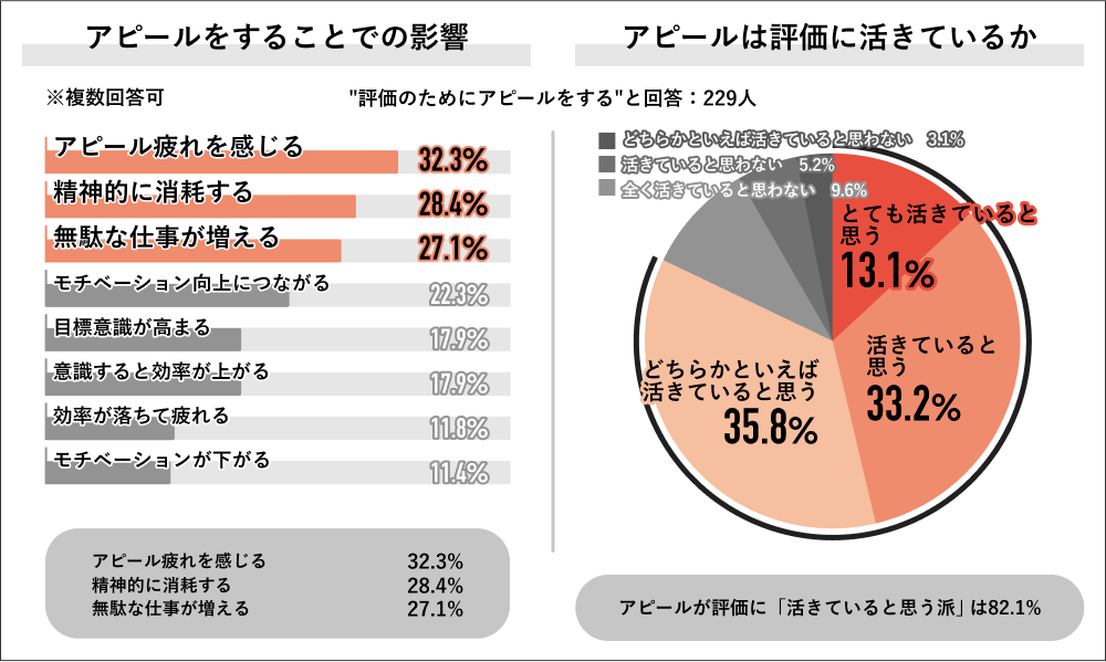 人事評価のためのアピールをすると回答した229人に、アピールをすることでの影響を聞くと、「アピール疲れを感じる」が32.3%で最多となり、次いで「精神的に消耗する」が28.4%、「無駄な仕事が増える」が27.1%となりました。また、アピールは評価に活きていると思うかを聞くと、「活きていると思う派」が82.1%で大多数を占め、内訳は「とても活きていると思う」が13.1%、「活きていると思う」が33.2%、「どちらかといえば活きていると思う」が35.8%となりました。
