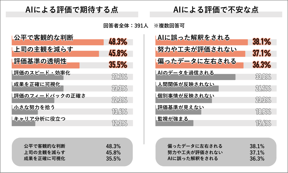 回答者全体の391人に、AIによる評価で期待する点を聞くと、「公平で客観的な判断」が48.3%で最多となり、次いで「上司の主観を減らす」が45.8%、「評価基準の透明性」が35.5%となりました。また、AIによる評価で不安な点を聞くと、「AIに誤った解釈をされる」が38.1%で最多となり、次いで「努力や工夫が評価されない」が37.1%、「偏ったデータに左右される」が36.3%となりました。