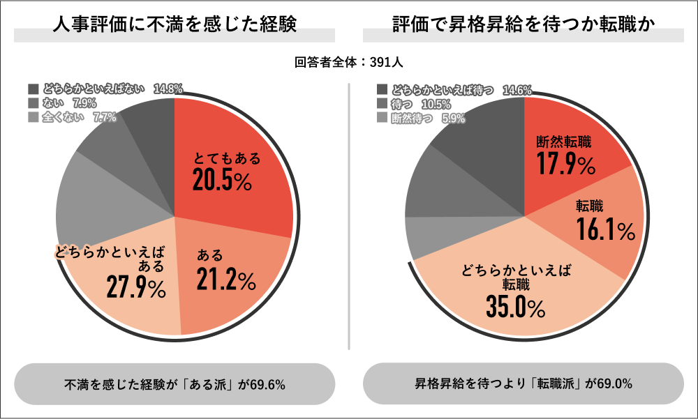 回答者全体の391人に、人事評価に不満を感じた経験を聞くと、「ある派」が69.6%と過半数を占め、内訳は「とてもある」が20.5%、「ある」が21.2%、「どちらかといえばある」が27.9%となりました。また、人事評価での昇格昇給を待つか転職かどちらを選ぶか聞くと、「転職派」が69.0%と過半数を占め、内訳は「断然転職」が17.9%、「転職」が16.1%、「どちらかといえば転職」が35.0%となりました。