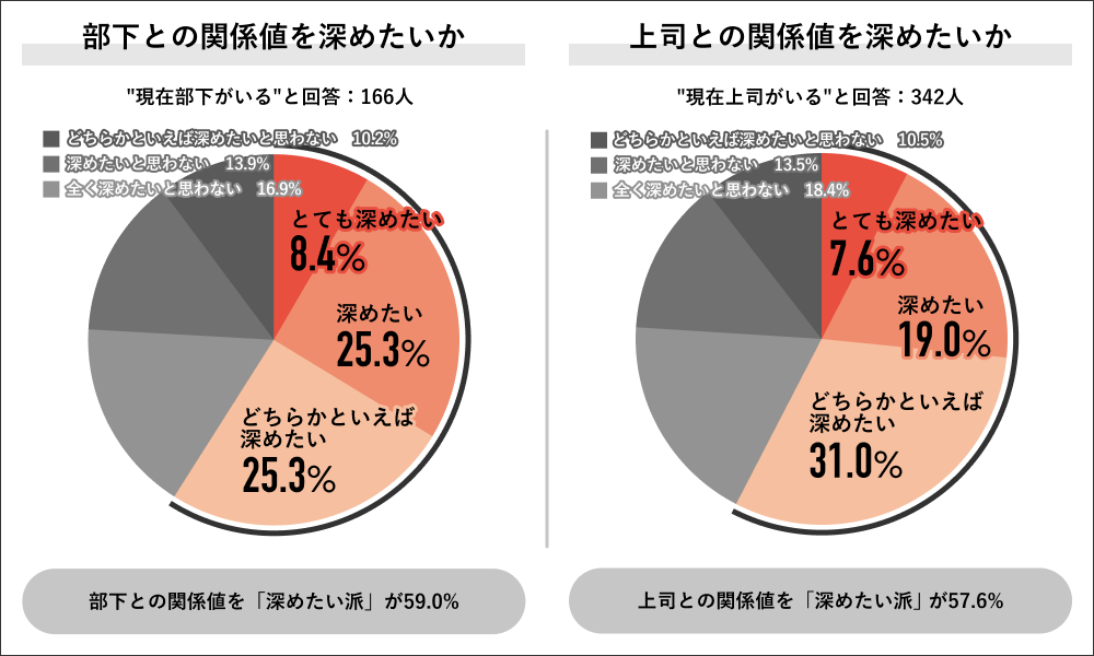 現在部下がいる166人に、部下との関係値を深めたいかを聞くと、「深めたい派」が59.0%と過半数を占め、内訳は「とても深めたい」が8.4%、「深めたい」が25.3%、「どちらかといえば深めたい」が25.3%となりました。現在上司がいる342人に、上司との関係値を深めたいかを聞くと、「深めたい派」が57.6%と過半数を占め、内訳は「とても深めたい」が7.6%、「深めたい」が19.0%、「どちらかといえば深めたい」が31.0%となりました。
