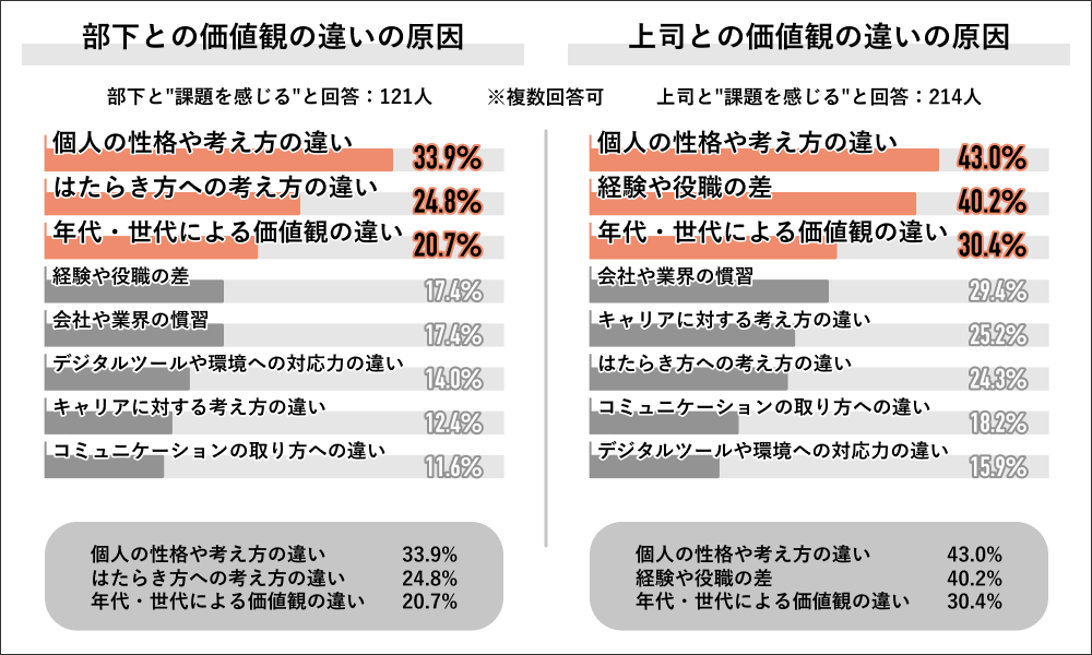 価値観の違いから生じる課題を感じると回答した上司121人に、その原因を聞くと、「個人の性格や考え方の違い」が33.9%で最多となり、次いで「はたらき方への考え方の違い」が24.8%、「年代・世代による価値観の違い」が20.7%となりました。価値観の違いから生じる課題を感じると回答した部下214人に、その原因を聞くと、「個人の性格や考え方の違い」が43.0%で最多となり、次いで「経験や役職の差」が40.2%、「年代・世代による価値観の違い」が30.4%となりました。