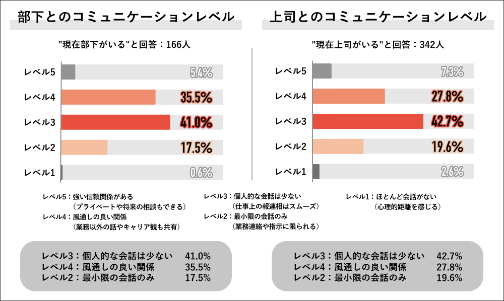 現在部下がいる166人に、部下との5段階(レベル5:強い信頼関係がある〜レベル1:ほとんど会話がない)のコミュニケーションレベルの中で該当するものを聞くと、「レベル3:個人的な会話は少ない」が41.0%と多数を占め、次いで「レベル4:風通しの良い関係」が35.5%、「レベル2:最小限の会話のみ」が17.5%となりました。同様に、現在上司がいる342人に、上司とのコミュニケーションレベルを聞くと、「レベル3:個人的な会話は少ない」が42.7%と多数を占め、次いで「レベル4:風通しの良い関係」が27.8%、「レベル2:最小限の会話のみ」が19.6%となりました。