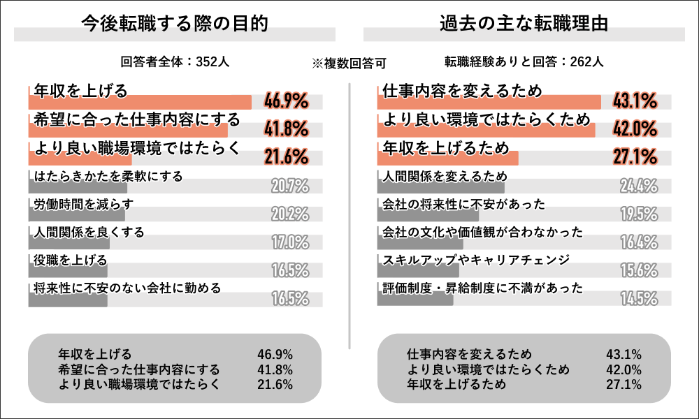 回答者全体の352人に今後転職する際の目的を聞くと、「年収を上げる」が46.9%で最多となり、次いで「希望に合った仕事内容にする」が41.8%、「より良い職場環境ではたらく」が21.6%となりました。転職経験ありと回答した262⼈に過去の主な転職理由を聞くと、「仕事内容を変えるため」が43.1%で最多となり、次いで「より良い環境ではたらくため」が42.0%、「年収を上げるため」が27.1%となりました。
