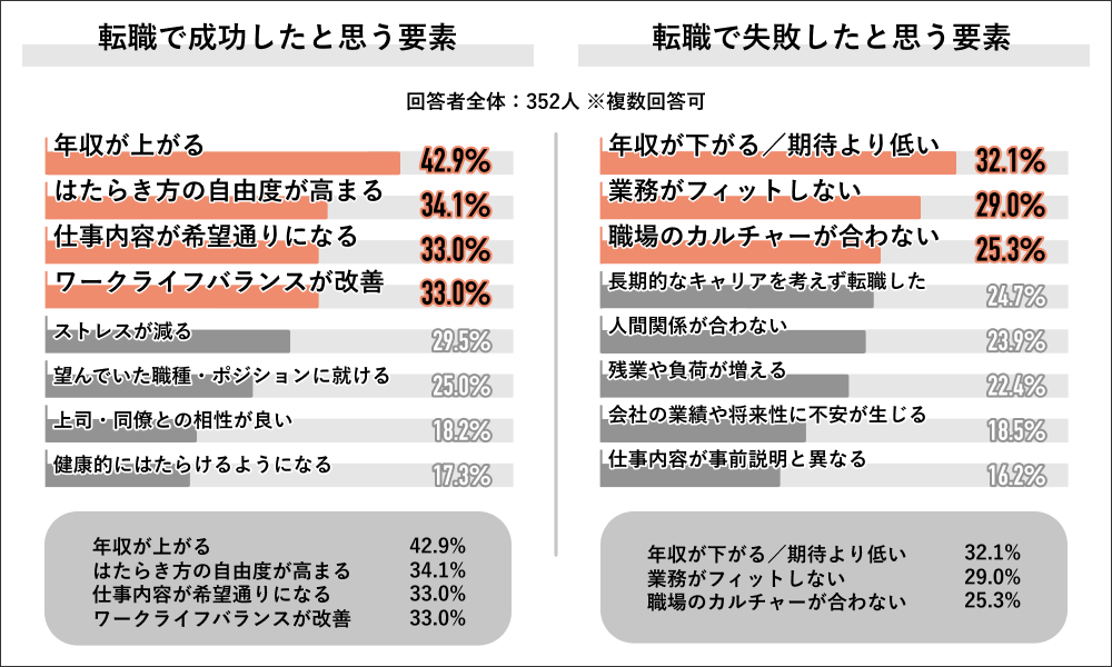 回答者全体の352人に転職で成功したと思う定義を聞くと、「年収が上がる」が42.9%で最多となり、次いで「はたらき方の自由度が高まる」が 34.1%、「仕事内容が希望通りになる」「ワークライフバランスが改善」が同率で 33.0%となりました。また、転職で失敗したと思う定義を聞くと、「年収が下がる/期待より低い」が32.1%で最多となり、次いで「業務がフィットしない」が 29.0%、「職場のカルチャーが合わない」が 25.3%となりました。