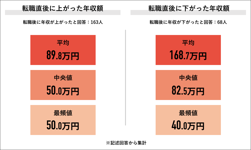 直近の転職で年収が上がったと回答した163人にその上昇額を聞くと、平均額は89.8万円、中央値と最頻値は50.0万円となりました。直近の転職で年収が下がったと回答した68人にその下落額を聞くと、平均額は168.7万円、中央値が82.5万円、最頻値が40.0万円となりました。