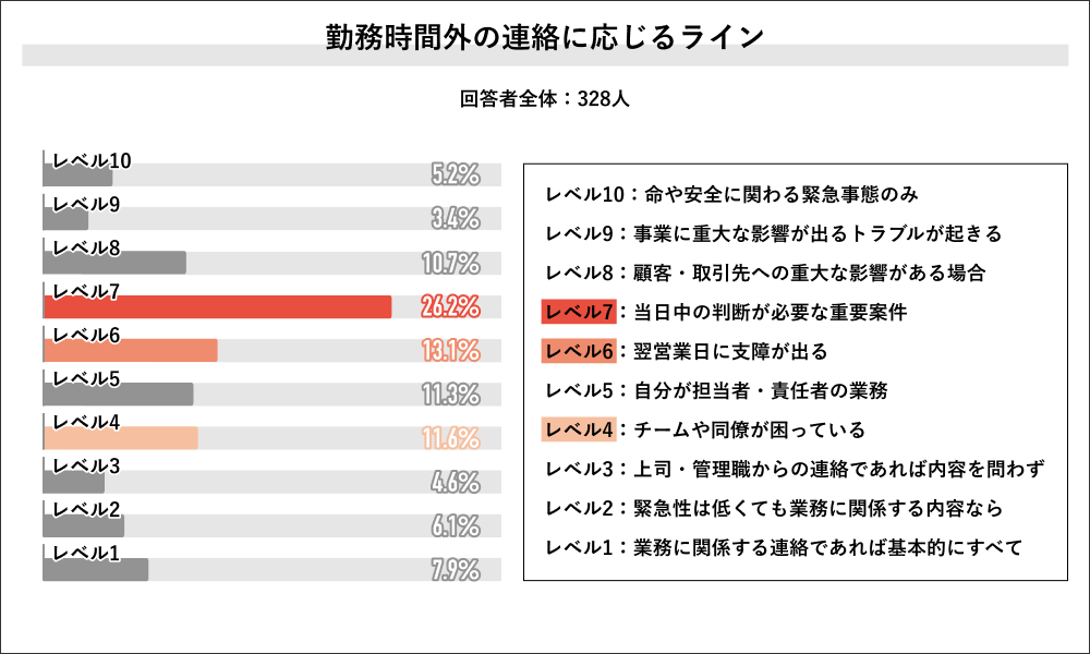 回答者全体の328人に、勤務時間外の連絡に応じるラインを聞くと、「レベル7:当日中の判断が必要な重要案件」が 26.2%で多数を占め、次いで「レベル6:翌営業日に支障が出る」が13.1%、「レベル4:チームや同僚が困っている」が11.6%となりました。