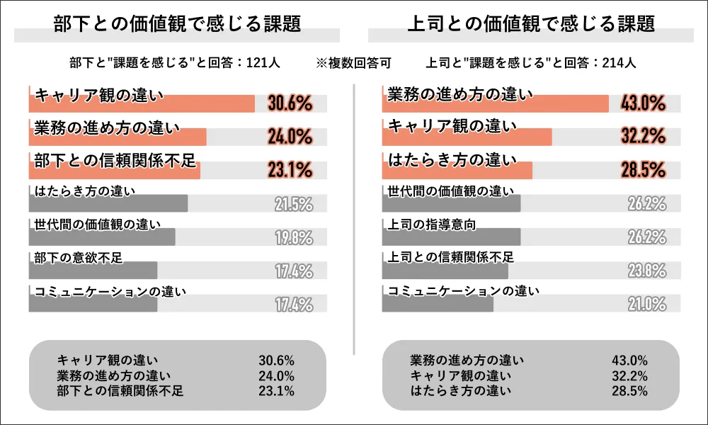 課題の内容としては、上司側では「キャリア観の違い」が30.6%で最多となり、部下側では「業務の進め方の違い」が43.0%で最多という結果が得られました。