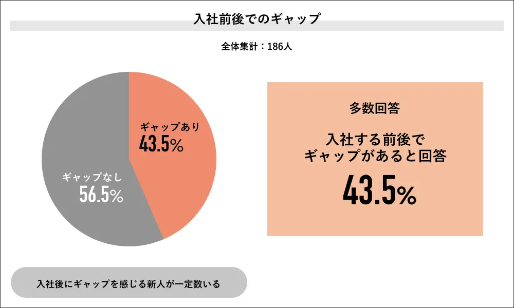 Job総研による「2021年新入社員実態調査」でも、入社後に業務内容や職場の雰囲気に対してギャップを感じる新人が一定数いることがわかっています。