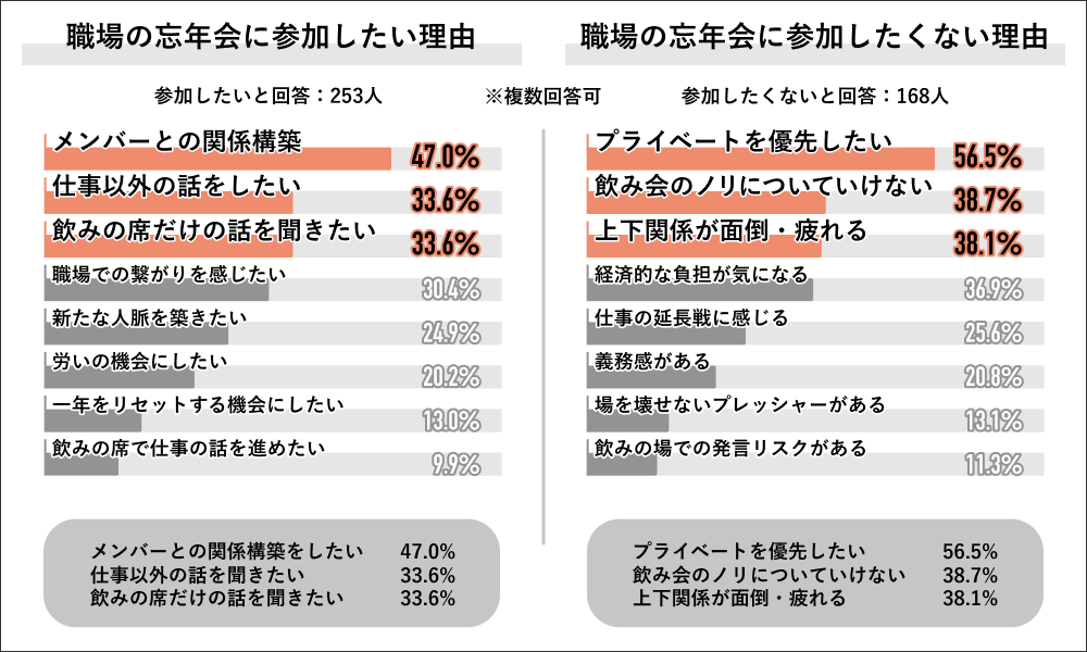 Job総研の調査によると、職場の忘年会に参加したい理由として「メンバーとの関係構築」が47.0%で最多となっています。