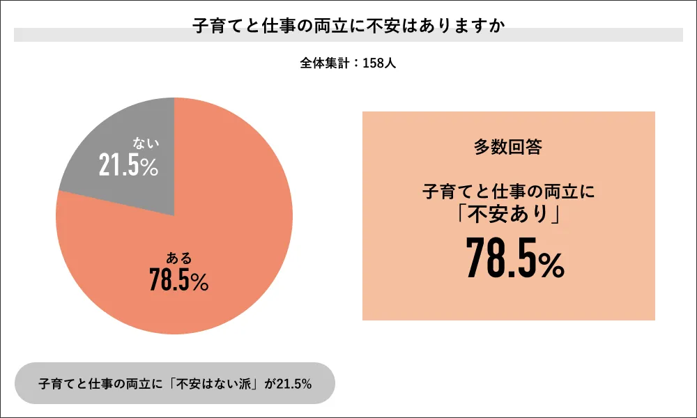 Job総研『2022年 女性のワークライフ実態調査』で、仕事と子育ての両立に不安があるかを聞くと、78.5%が「不安あり」と回答しました。