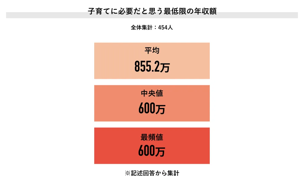 しかし、同じ調査で「子育てに必要な最低限の年収額」を聞いたところ、平均額は855.2万円(中央値600万円)という結果に。現実の年収と理想的な年収には約384万円もの大きな開きがあることが分かります。