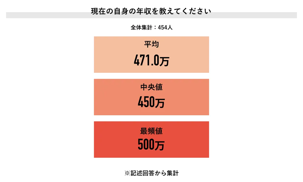 Job総研が実施した「2023年 少子化に関する意識調査」によると、20〜30代の社会人男女454人の現在の年収平均額は471.0万円(中央値450万円)でした。