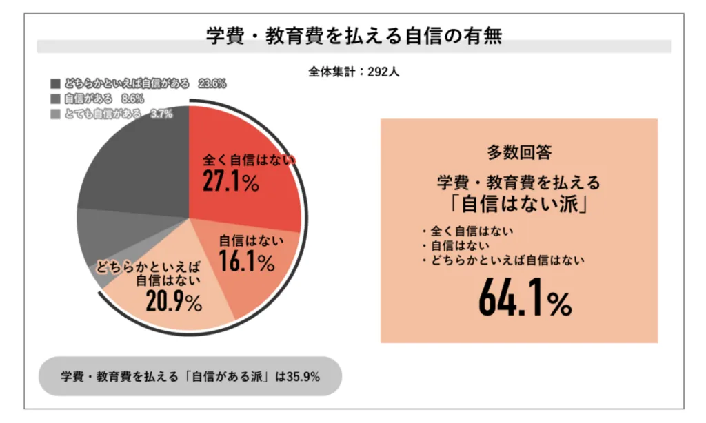 同調査内で、「学費・教育費を払える自信の有無」について尋ねたところ、全体の6割が「自信はない」と回答しました。多くの親が将来の教育費に対して具体的な不安を抱えている実態が明らかになっています。