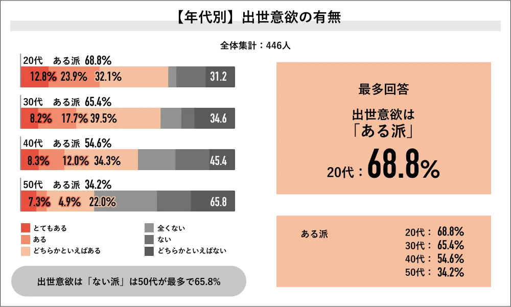 興味深いのは、年齢が上がるにつれて出世意欲が低下していく傾向が見られることです。20代では7割近くが出世を望んでいるのに対し、30代は34.6%、40代では54.6%、50代では34.2%の人が出世を望んでいません。