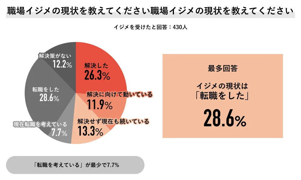 深刻なのは、「職場イジメをきっかけに転職をした」と回答した割合が28.6%にものぼっていることです。