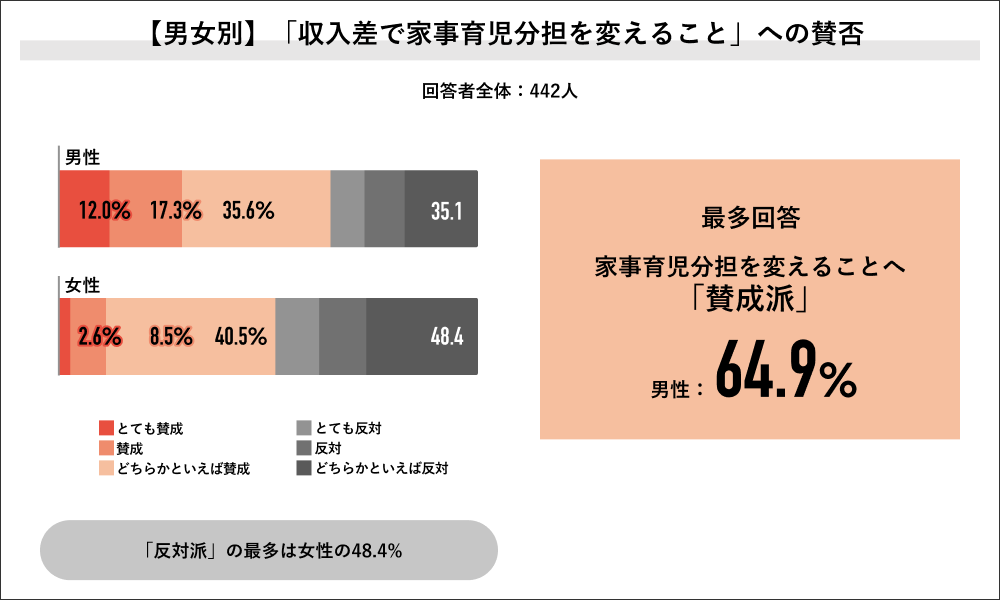 大多数は積極的に賛成しているわけではないものの、現実問題として「収入は家事育児の分担割合を決める基準として妥当」と判断していることがわかります。