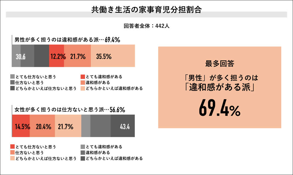 Job総研では、回答者全体の442人に対し「共働き生活での家事育児分担割合への印象」を尋ねました。