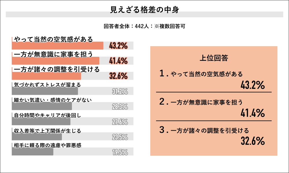 次いで多かったのが「一方が無意識に家事を担う」(41.4%)。さらに「一方が諸々の調整を引受ける」(32.6%)が続きます。