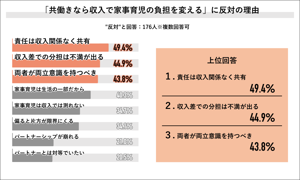 また「ナシ」と回答した176人にその理由を聞くと、最多は「責任は収入関係なく共有」(49.4%)で、「収入差での分担は不満が出る」(44.9%)、「両者が両立意識を持つべき」(43.8%)と続きます。