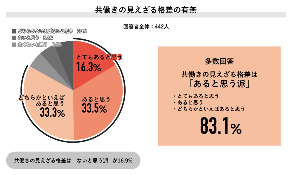 Job総研が、回答者全体の442人に「共働きにおいて見えざる格差(負担や期待の違いなど)があるかどうか」を尋ねたところ、実に83.1%の人が「あると思う派」の回答をしました。