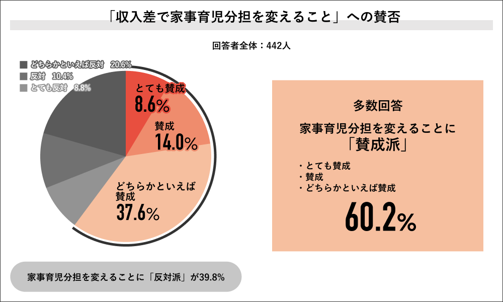 Job総研の調査によると、回答者の60.2%が「収入差で家事育児の負担を変える」ことについて「アリ」と回答しました。