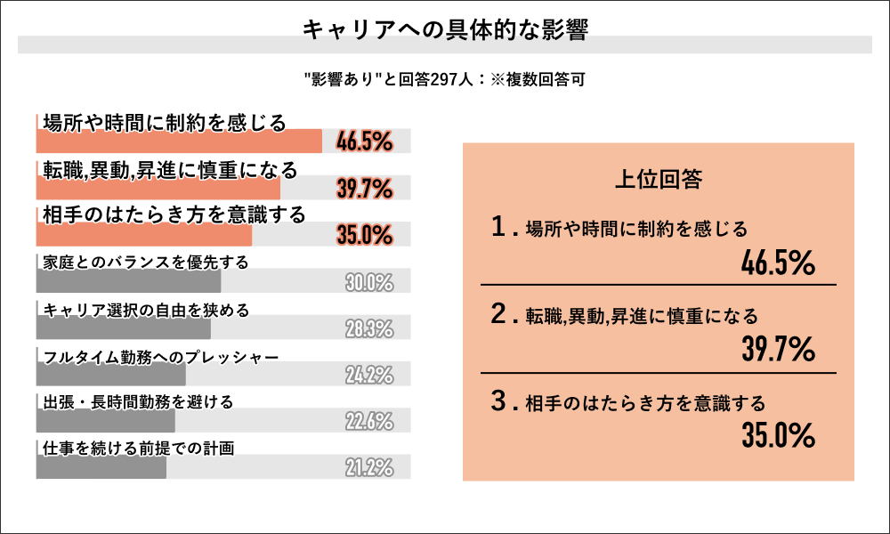 「ある派」297人に具体的な影響を聞くと、もっとも多かったのが「場所や時間に制約を感じる」(46.5%)でした。次いで「転職、異動、昇進に慎重になる」(39.7%)、「相手のはたらき方を意識する」(35.0%)と続きます。