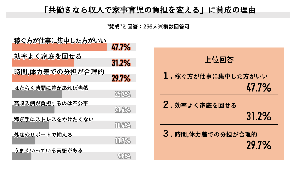 「収入差で家事育児の負担を変える」ことに「アリ」と回答した266人にその理由を聞いたところ、「稼ぐ方が仕事に集中した方がいい」(47.7%)が最多となり、次いで「効率よく家庭を回せる」(31.2%)、「時間、体力の差での分担が合理的」(29.7%)となりました。
