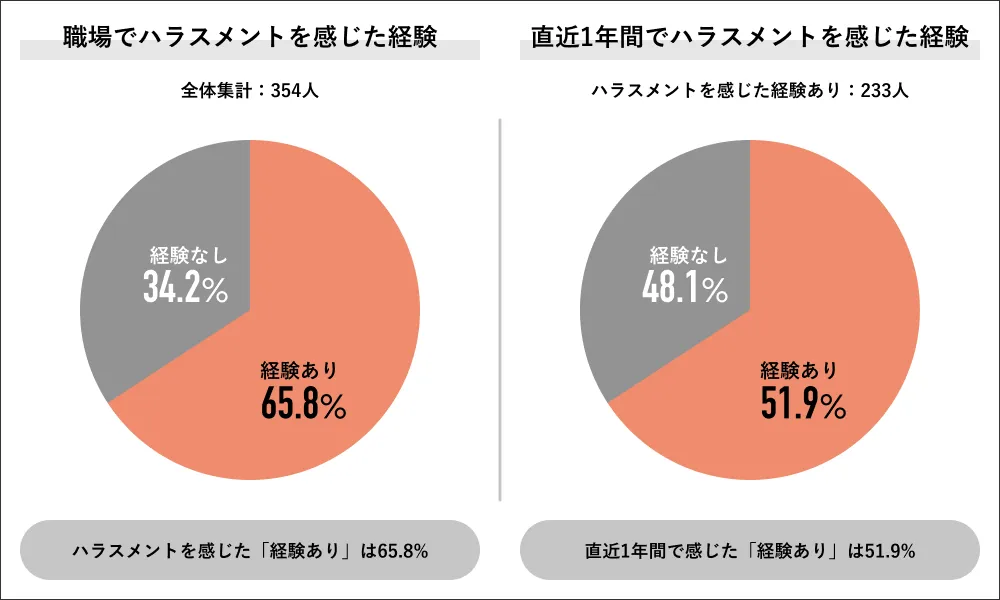 職場のトラブルは、今や決して他人事ではありません。Job総研が実施した「2023年ハラスメント実態調査」によると、職場でハラスメントを感じた経験がある人は65.8%にのぼり、多くの従業員が悩みを抱えている現状がうかがえます。