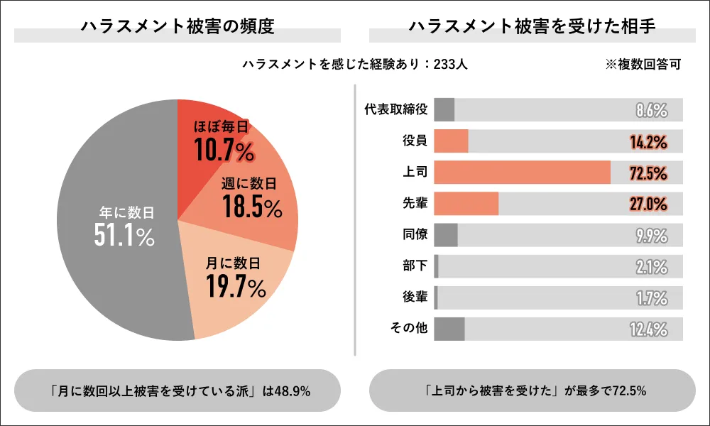 加害者は上司や先輩が大多数を占めるものの、2.1%と少数ながら「部下から上司へ」の被害も存在します。