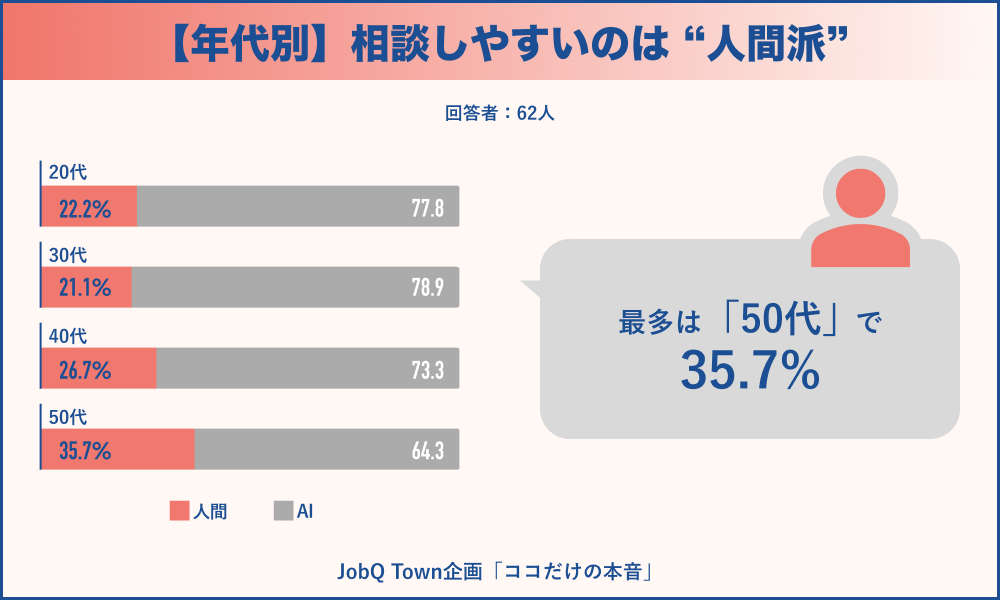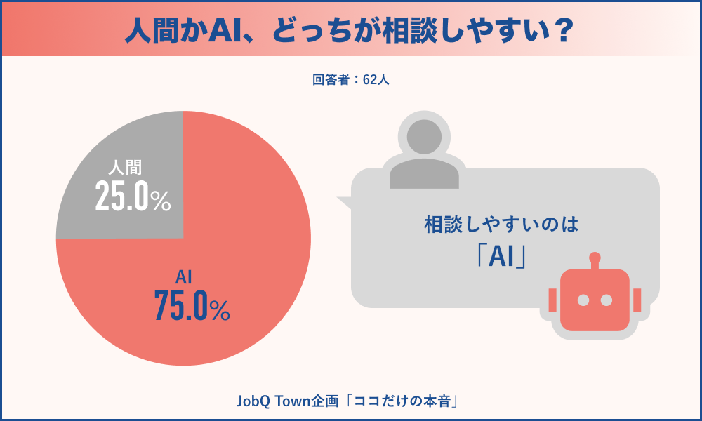 JobQ Town ココだけの本音で行ったアンケートでは、「AIの方が相談しやすい」と答えた人が75%、「人間の方が相談しやすい」と答えた人が25%でした。