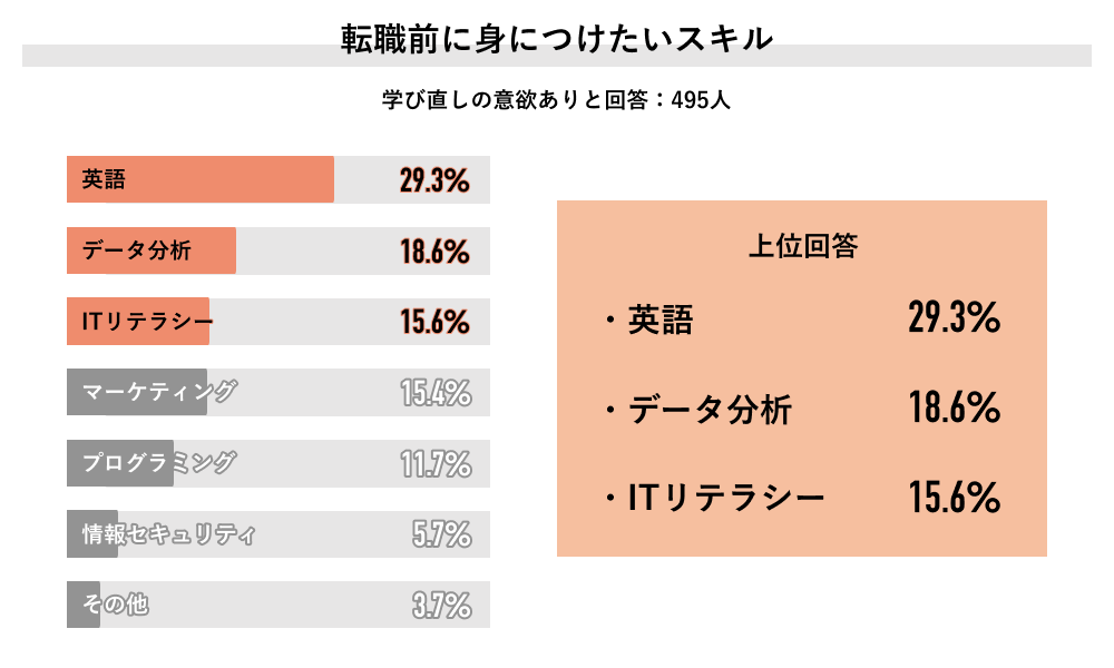 実際に学び直しを検討している人は、転職前にどのようなスキルを身につけたいと考えているのでしょうか。Job総研の調査から、現在最も注目されている学習分野を紹介します。