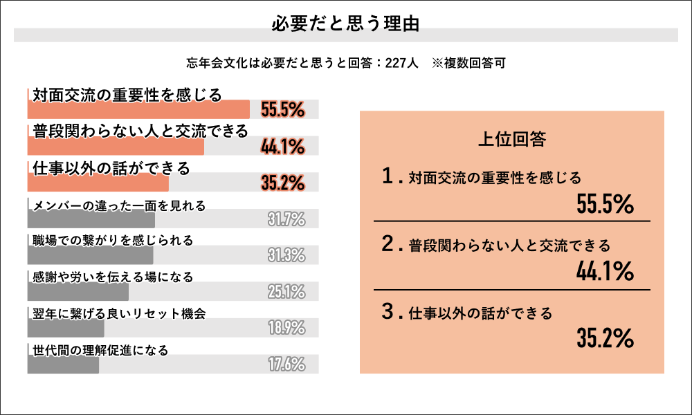 必要派の意見でもっとも多かったのは「対面交流の重要性を感じる」で55.5%。次いで「普段関わらない人と交流できる」が44.1%、「仕事以外の話ができる」が35.2%となりました。