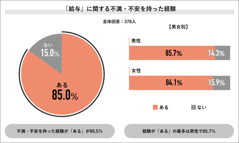 Job総研が実施した「給与に関するリアル」の調査では、社会人の85.0%が給与に関する不満や不安を持った経験があると回答しました。