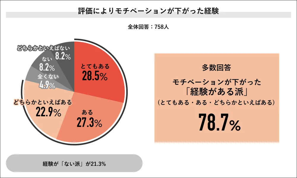 Job総研の調査では、評価によってモチベーションが下がった経験がある人が78.7%に上っており、成果と報酬が結びつかない職場では意欲が持続しにくい構造が浮き彫りに。
