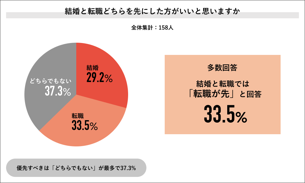 Job総研の同調査で、結婚と転職どちらを先にした方が良いと考えるかについて聞くと、33.5%の女性が「転職」が先にするのがおすすめと回答しています。「結婚」は29.2%、「どちらでもない」は37.3%でした。