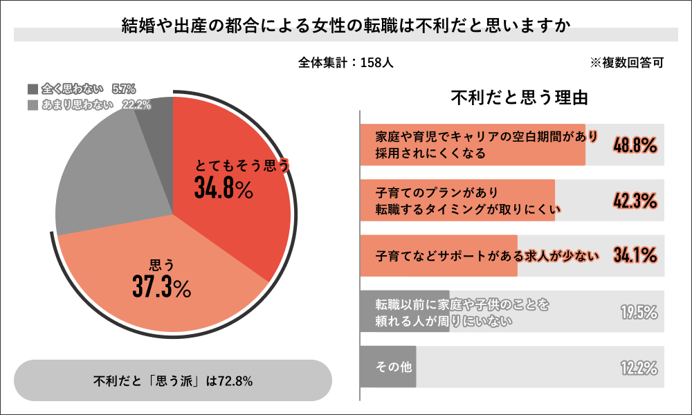 その理由で最も多かったのは「家庭や育児でキャリアに空白ができ採用されにくくなる」が48.8%で、次いで「子育てで転職するタイミングが取りづらい」が42.3%、「子育ての理解やサポートがある求人が少ない」が34.1%でした。