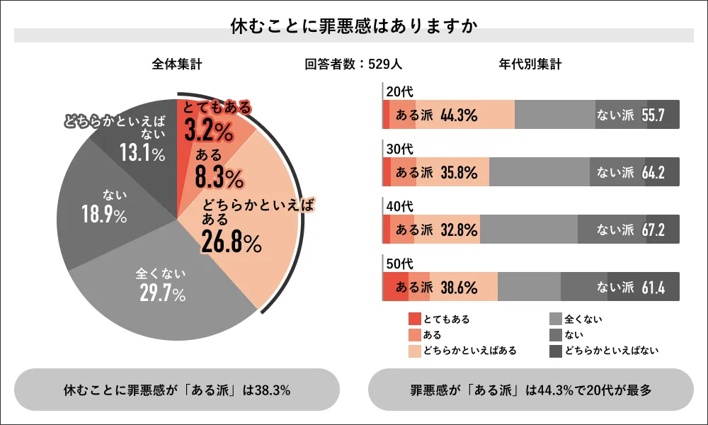 Job総研が実施した調査によると、休むことに罪悪感を感じている人は38.3%でした。約4割の人が、休暇の取得をネガティブに捉えていることが分かります。