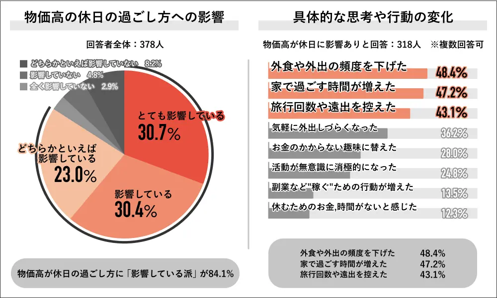 同じくJob総研の調査では、84.1%の人が「物価高が休日の過ごし方に影響している」と回答。