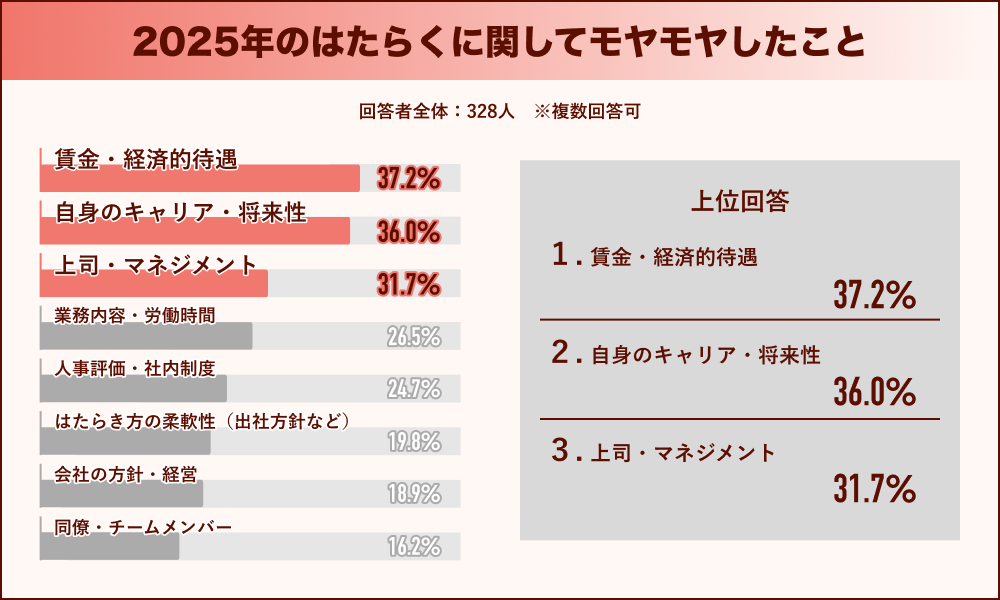 アンケートで最も多かったのは「賃金・経済的待遇(37.2%)」への不満。2025年は物価高がじわじわとお財布を直撃し、「せっかく昇格・昇給したのに、支出を考えたらトントンかも……」と、豊かさの実感を持てなかった人が多かったようです。
