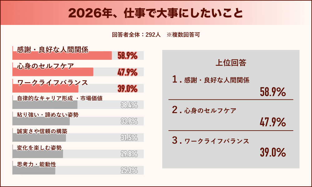 2025年の社会情勢や忙しさを受けてか、2026年の抱負には興味深い変化が見られます。Job総研が2026年の年始に「2026年、仕事で大事にしたいこと」を調査したところ、1位は「感謝すること・良好な人間関係(58.9%)」、2位は「心身のセルフケア(47.9%)」でした。