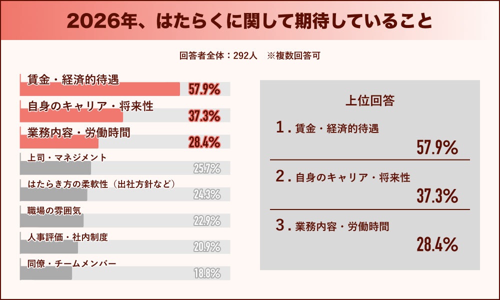 最も多かったのは「賃金・経済的待遇の向上(57.9%)」でした。物価高への不安を解消し、自分の頑張りが目に見える形で報われることを、多くの人が切実に願っています。