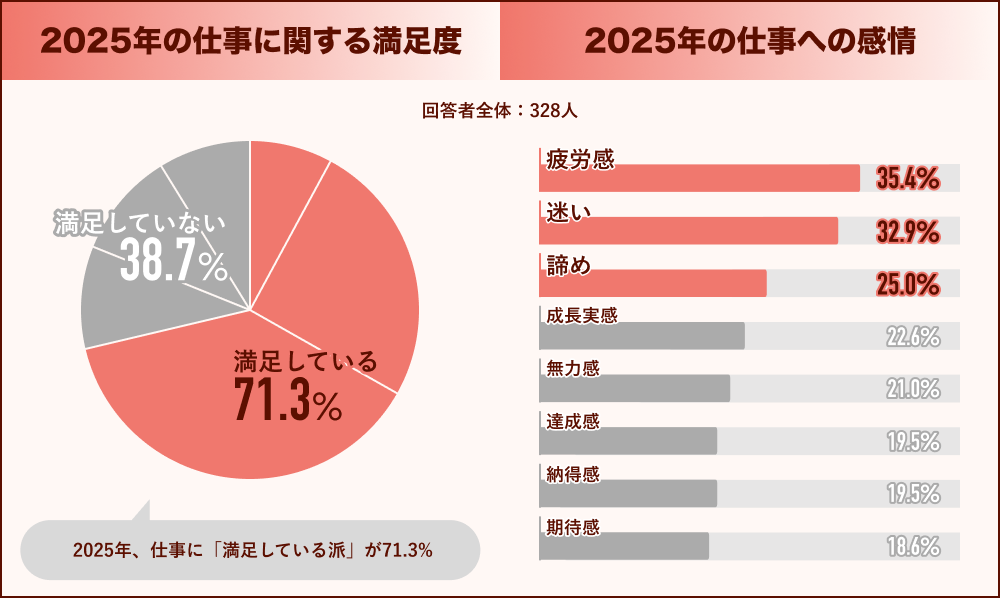 「2025年、やり切った!」と胸を張れる人って、実は結構多いみたいです。Job総研が2025年の「はたらくに関する満足度」を調査したところ、約71.3%の人が「満足している」と回答。何かとハードな一年でしたが、約7割の人が目の前の仕事に自分なりに全力で向き合っていたことがわかります。