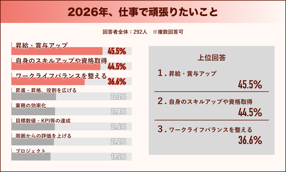 さらに、「ワークライフバランスを整える(36.6%)」も上位にランクイン。ただがむしゃらに動くのではなく、賢く効率的に進めて自分の時間も守り抜く。そんな「自分のペースを大切にするはたらき方」を目指すのが、2026年流の抱負といえそうです。
