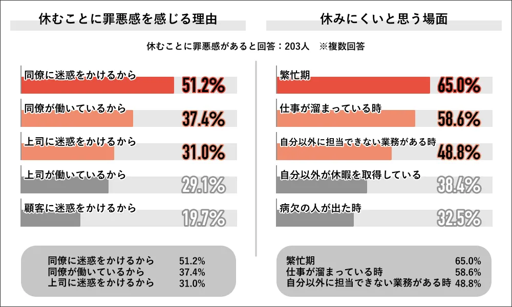 有給休暇をためらう最大の理由は、周囲への「優しさ」や「気づかい」です。調査では、罪悪感を感じる理由として「同僚に迷惑をかけるから(51.2%)」が最多で、次いで「同僚が働いているから(37.4%)」が続きました。