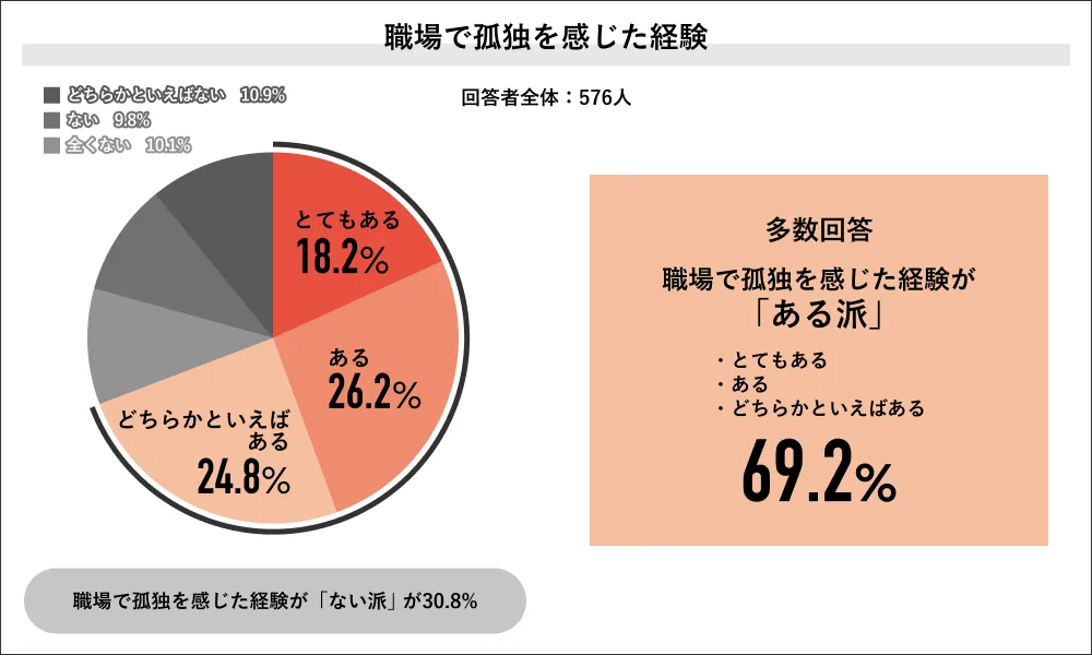 Job総研が実施した『2025年 職場の孤独実態調査』によると、回答者全体にあたる576人のうち、69.2%が「職場で孤独を感じた経験がある」と答えました。実に7割近くの人が職場での孤独を経験しているのです。