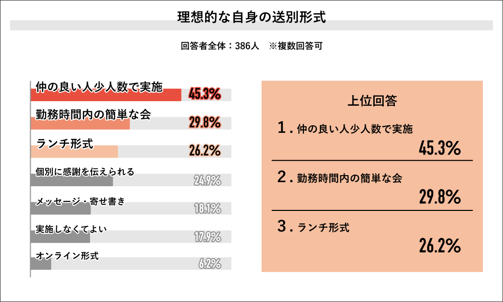 Job総研の調査では、理想的な(自身の)送別会形式として、もっとも多かったのが「仲のいい人たちだけで実施」で45.3%でした。次に「勤務時間内の簡単な会」が29.8%、「ランチ形式」が26.2%と続きます。