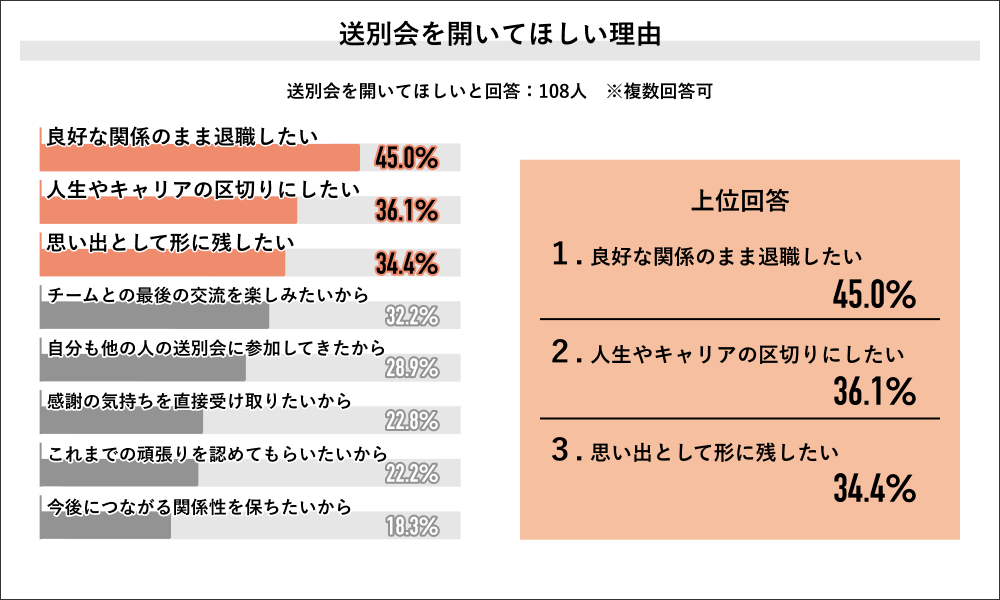 また、退職時に送別会を開いてほしくないと回答した人の理由としてもっとも多かったのが、「気を遣わせてしまうのが嫌」で51.0%。次いで「静かに区切りをつけたい」が43.2%、「目立つことが苦手」が41.3%と続きました。